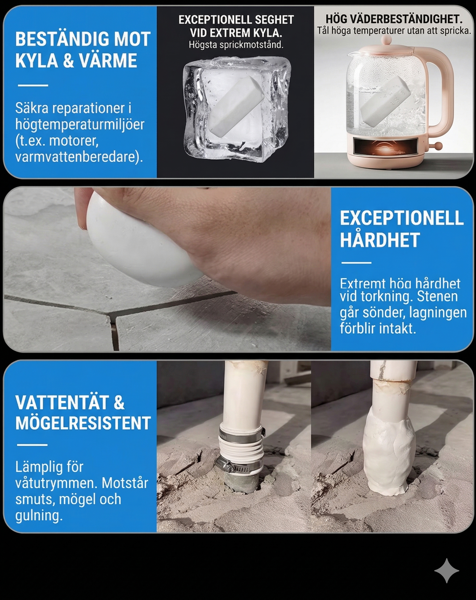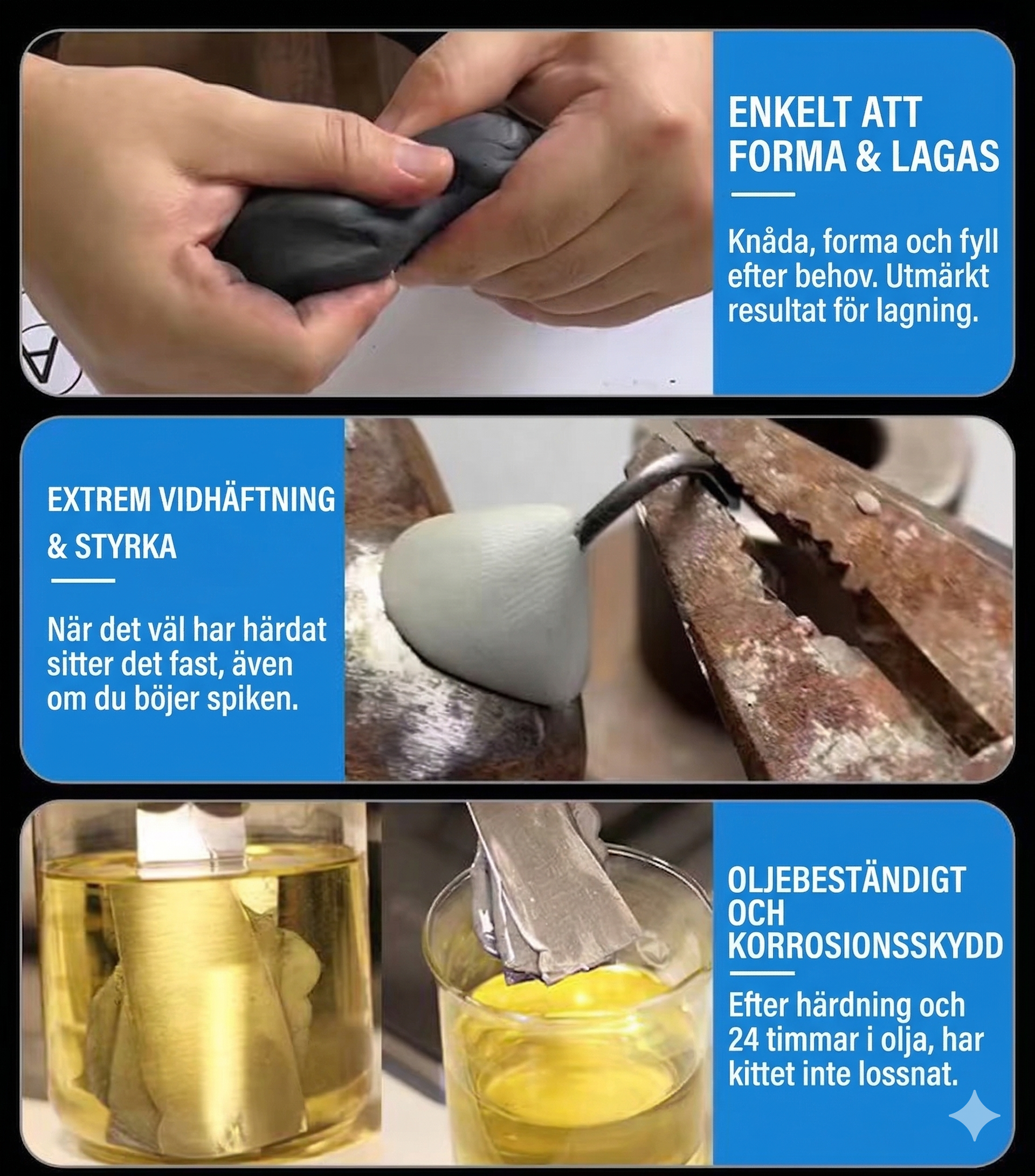 När kittet väl har härdat förvandlas det och blir otroligt starkt och hållbart, precis som metall eller sten. Du kan därefter utan problem borra, slipa, fila och till och med måla över ytan. Detta ger dig en helt osynlig, snygg och professionell reparation som verkligen håller måttet över tid.