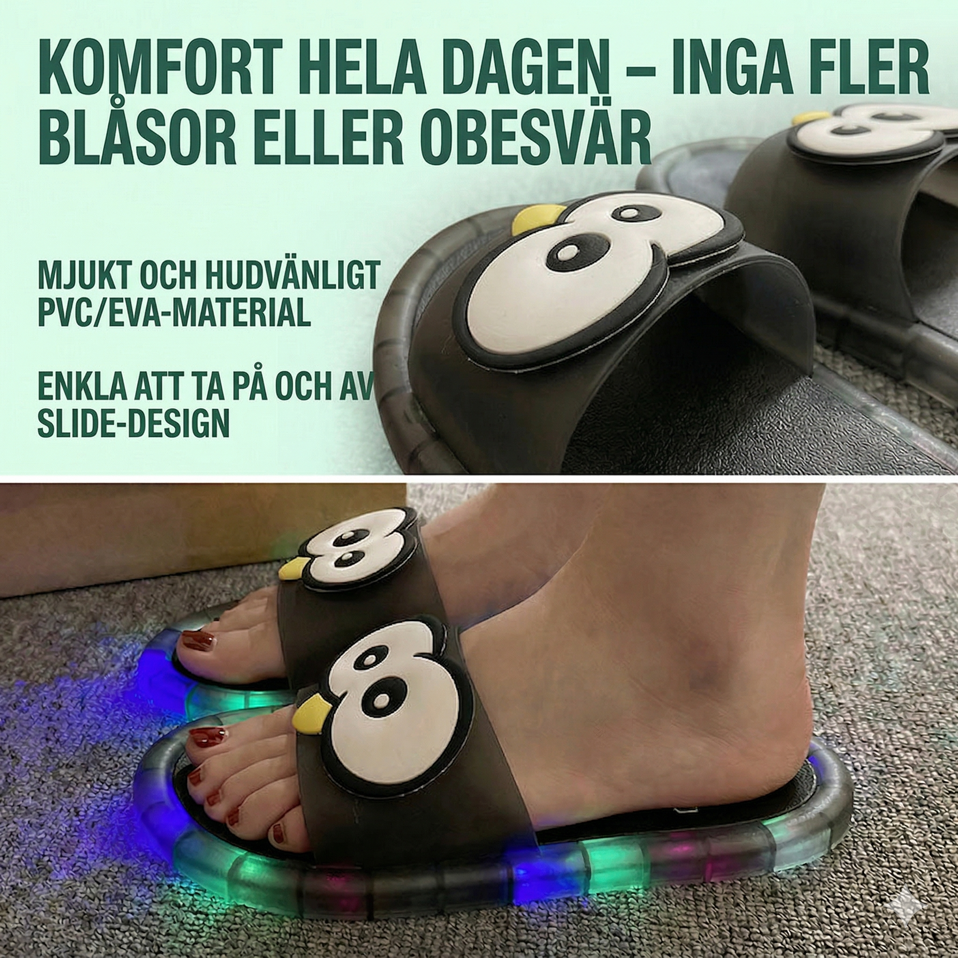 Lekfull och iögonfallande design Kliv in i rampljuset med dessa unika tofflor som omedelbart sprider glädje vid varje steg. Den lekfulla karaktärsdesignen med stora ögon och gul näbb, kombinerat med en färgglad ovandel och genomskinliga sulor, gör dem till en riktig blickfångare i solljuset. Oavsett om du strosar runt hemma, är på en avslappnad dejt eller uträttar ärenden, ger de din stil en charmig och personlig touch.