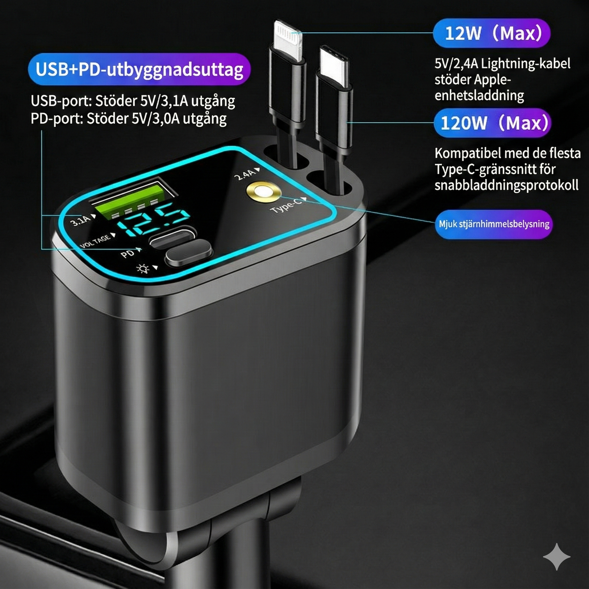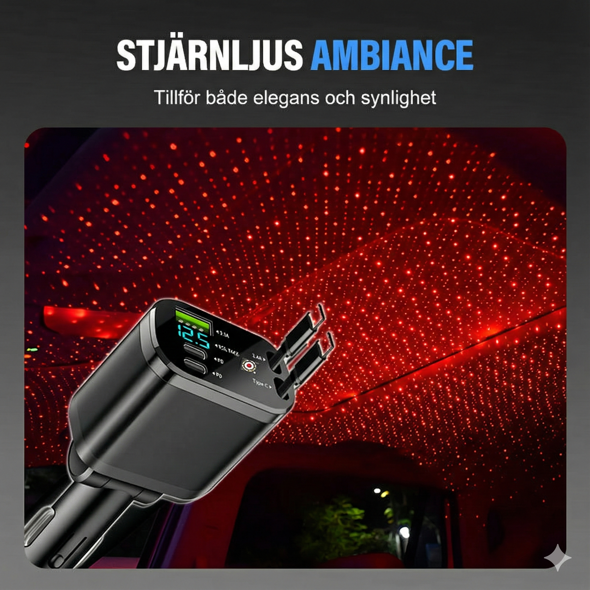 Exklusiv stjärnhimmel och kompakt form Förhöj körupplevelsen med den inbyggda stämningsbelysningen som projicerar en diskret stjärnhimmel, vilket ger interiören en elegant touch och ökad synlighet i mörkret. Laddaren har en kompakt och lätt design som smälter in i uttaget utan att vara i vägen. Den robusta konstruktionen är byggd för att stå emot dagligt slitage och garanterar en långvarig och pålitlig prestanda.